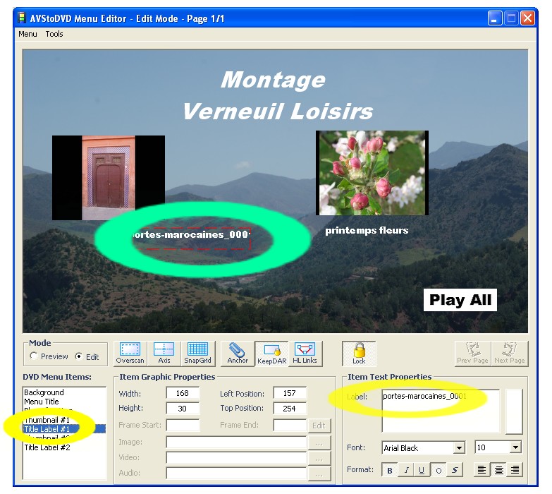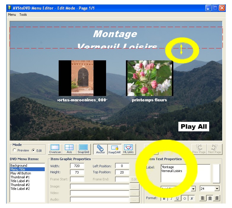 Nous pouvons afficher un titre, (Menu Title) et nous écrivons dasn la zone contigüe à Label. Pour l'avoir sur 2 lignes il suffit de faire "entrer" à la fin de la première.