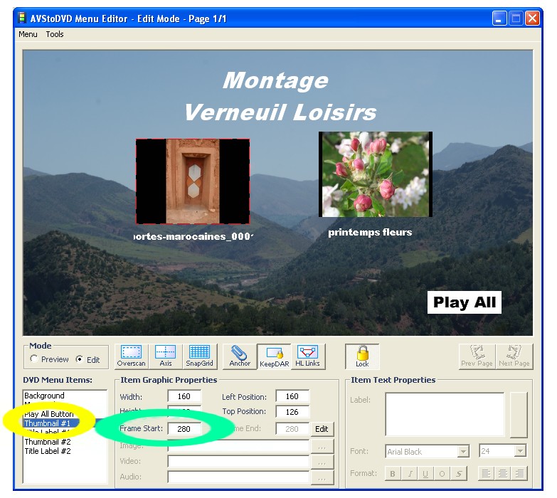 "Frame Start" fixe le début du défilement des images de la vignette. |